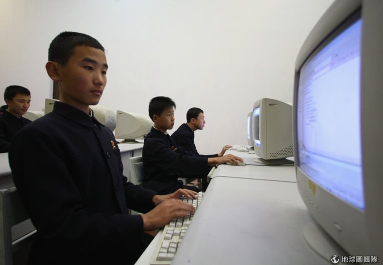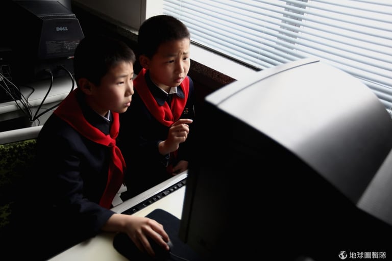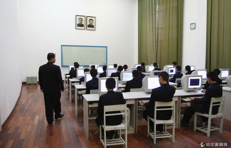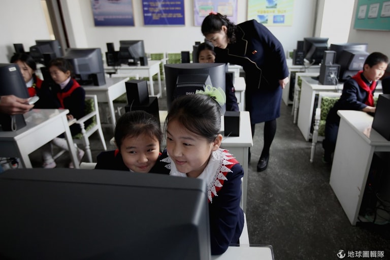 平壤當地的小學,穿著傳統服裝的老師正在教大家用電腦。圖片來源:Feng Li/Getty Images