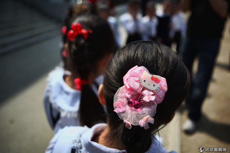 果然流行文化的感染力是最強的!代表日本來的Hello Kitty竟然可以出現在北韓小女生身上!圖片來源:Feng Li/Getty Images