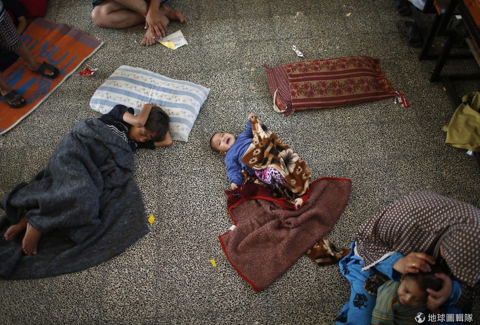 巴勒斯坦的小朋友們睡在學校地板上,他們為了逃避以巴衝突戰火,全擠到了聯合國設立的學校中。從7月初開始的以巴交火,即將就要滿月,但以色列和加薩走廊的哈瑪斯組織都沒有停手的打算。目前加薩居民死亡數破千人,其中更有8名是聯合國人員。