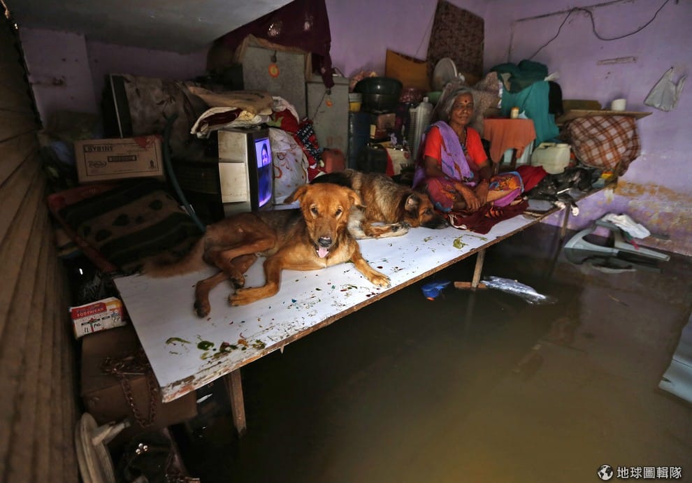 因為雨季帶來的大水淹沒家園,照片中的女性和她的狗一同坐在淹水的家園中。
