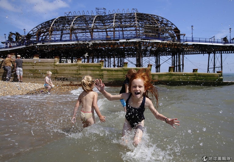 孩子們在剛被大火肆虐過的遊樂園附近的沙灘上玩耍,英國的伊斯特本(Eastbourne)區就位在英格蘭東南區,當地從石器時代就已經有人類活動,但直到19世紀仍是個由四個小村落合併成的小市鎮。籍著鐵路的發展,伊斯特本成了一個原始維多利亞式的渡假區,每年都可以見到遊客湧入。