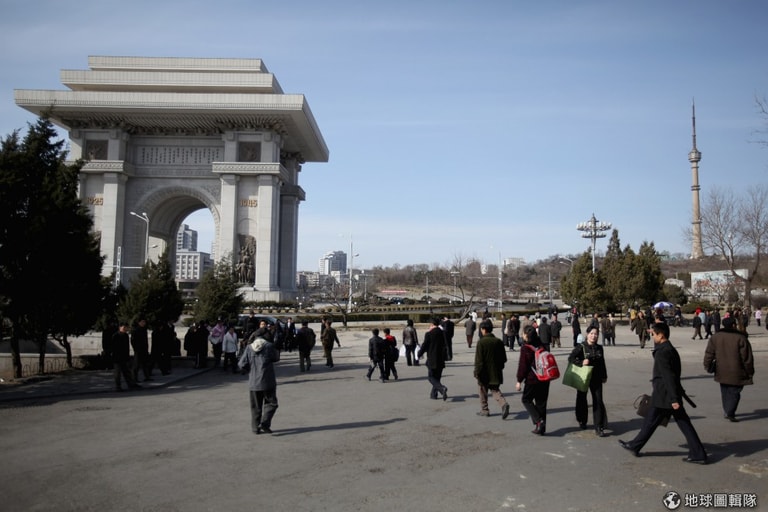 民眾走在平壤市區內,後面是北韓的「凱旋門」(The Arch of Triumph),這建於1970年代的建築,比巴黎的凱旋門還高喔!圖片來源:Feng Li/Getty Images