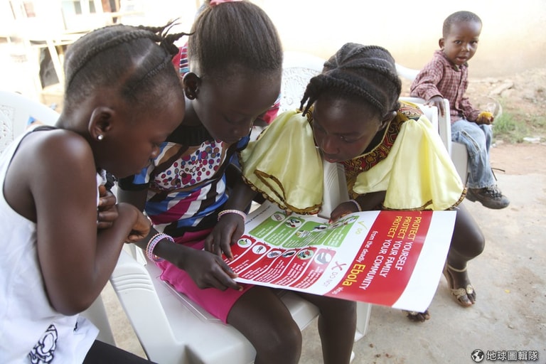 照片是正在看伊波拉病毒衛教海報的小女孩。這份海報是由聯合國兒童基金會(UNICEF)所製作。