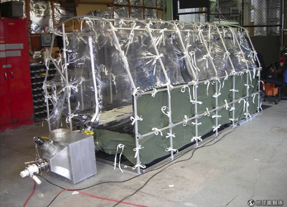 照片是救護專機內安置的輕便帳棚病床,特別設計來運送染上高傳染疾病的患者。