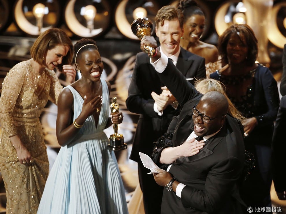 照片中,電影「自由之心」的導演史蒂夫麥奎因欣喜若狂地奪下2014年奧斯卡金像獎。
