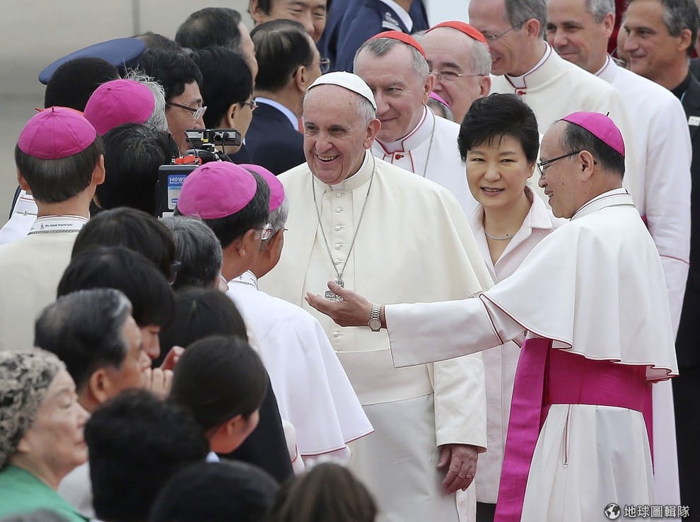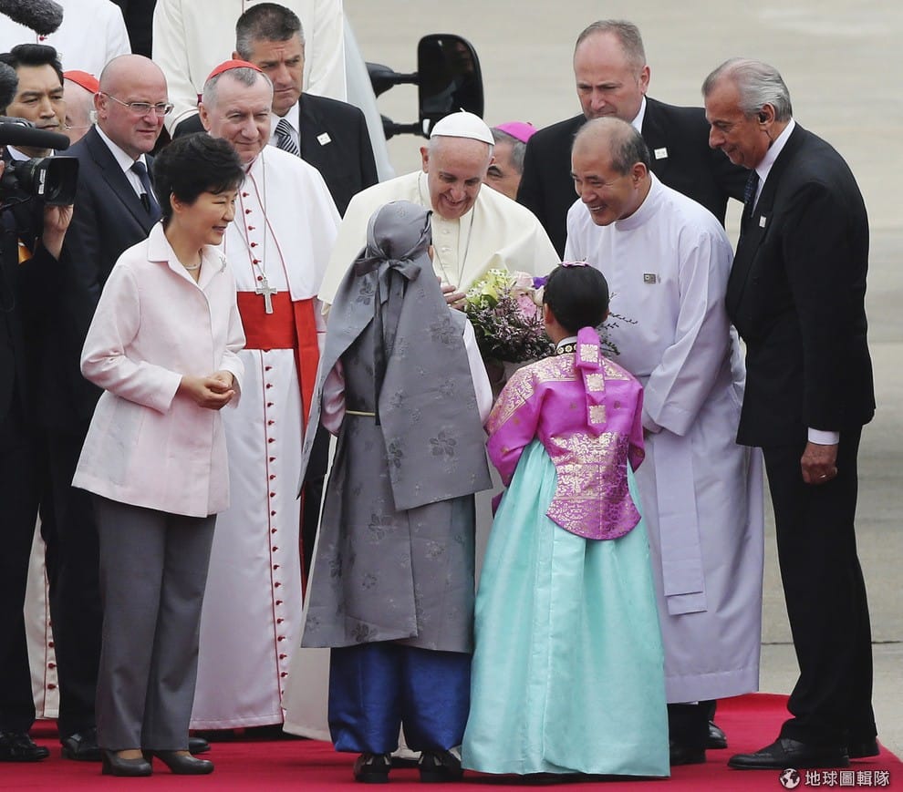 南韓總統朴槿惠(圖左)親赴首爾機場迎接羅馬教皇方濟各(圖中),照片中教宗方濟各正接受身穿韓服兒童的歡迎獻花。