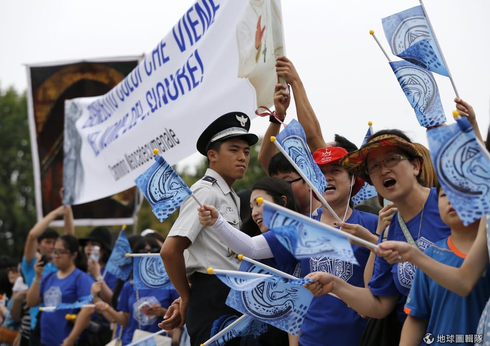 照片中熱情的南韓天主教徒親自到首爾機場歡迎羅馬教宗方濟各。