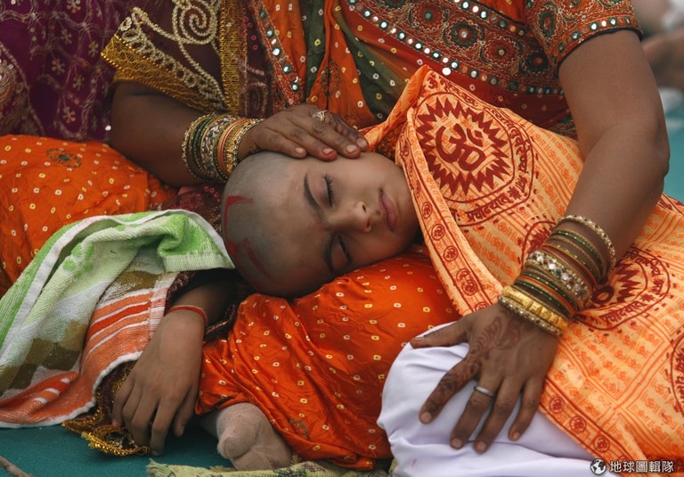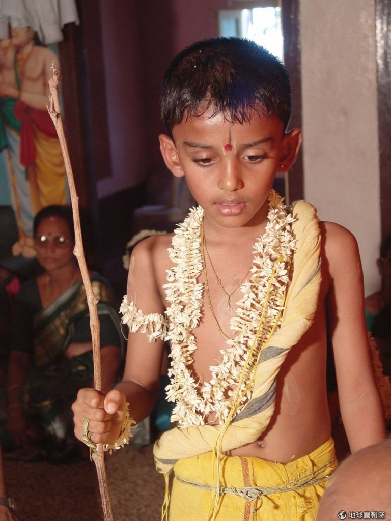屬於種姓制中婆羅門級的男孩,會穿上橘色並揹上鹿皮袋,這樣的裝扮象徵傳統婆羅僧人的角色,其他種姓階級的男孩則會使用不同的物件。其實,這項儀式大部分是在披肩下完成,而且還是由男孩的精神導師「古魯」(Guru)來主導,男孩有時候會為了增添新物品到火中才會脫下披肩。