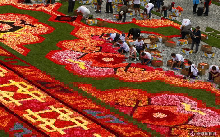 「布魯塞爾花毯節」是比利時首都布魯塞爾最重要的暑期活動,為期4天,從1971年開始每兩年舉辦一次,通常在熱心市民當日完成花毯布置的夜晚,會在「黃金大廣場」(Grand Place)上以煙火搭配音樂絢麗開幕。