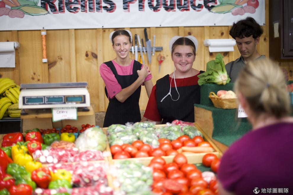 阿米希女孩們正在水果攤上和顧客談笑。
