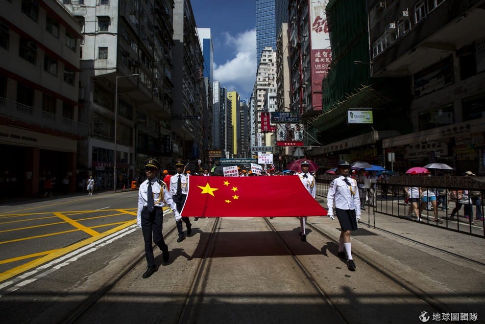年輕人穿著制服並一同拿著中國國旗在香港中環一帶遊行,17號這天,香港出現一群反對親民主活動「佔領中環」的人士,預估人數大約上萬左右,這些民眾要表達對佔領中環活動的不滿,這也顯示出香港在政治改革等議題上正陷入越來越深的歧見。