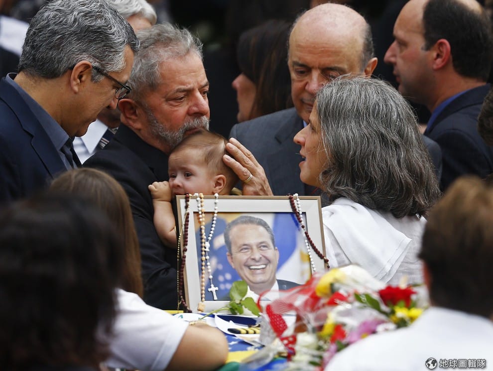 照片中是巴西前總統達席爾瓦(左2,Luiz Inacio Lula da Silva),他抱著已故總統候選人甘伯斯(Eduardo Campos)的孩子,跟他的太太一同哀悼甘伯斯的過世。根據報導,巴西總統候選人,現年49歲甘伯斯,他的競選班機在13日惡劣天氣中,撞進聖多斯(Santos)民宅墜毀,機上7人全數罹難,多棟建築也燃起熊熊大火。