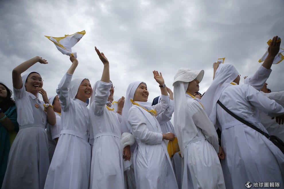 修女們看到天主教教宗方濟各現身,興奮地揮手致意。17號這天,教宗在南韓的海美邑城(Haemi Castle)參加第六屆亞洲青年日的閉幕典禮。