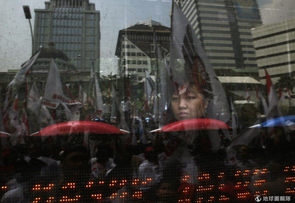 一名女性從巴士的窗戶向外望,她與其他人是支持印尼落選總統候選人普拉伯沃(Prabowo Subianto)的民眾,20號這天,印尼憲法法庭將宣布普拉伯沃提出選舉不公的上訴無效。