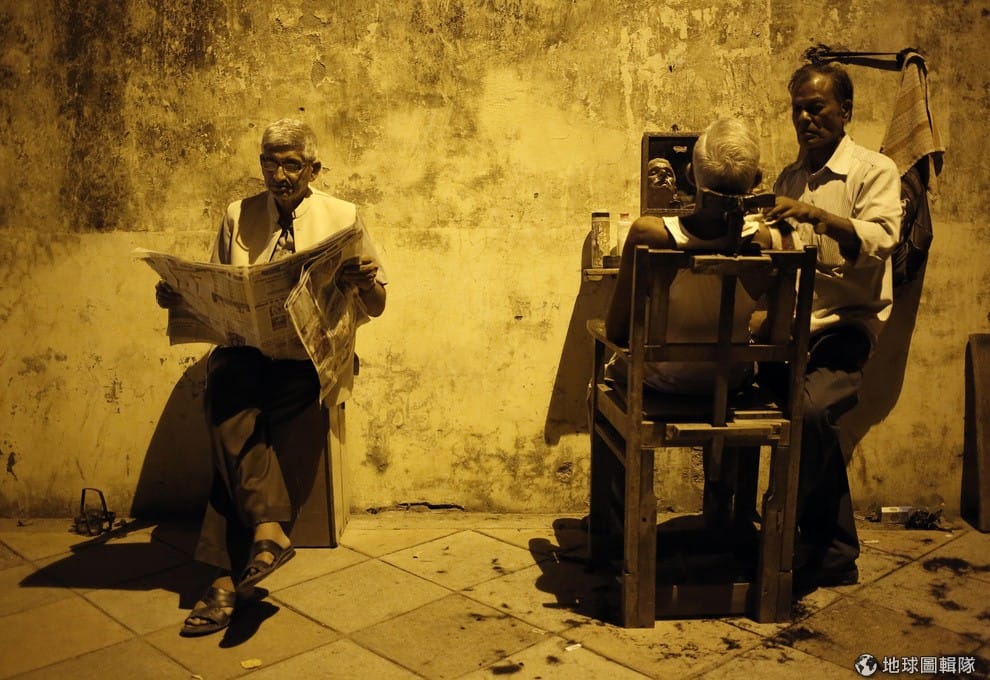 新德里市區中,路邊可見男性正排隊等待刮鬍子。