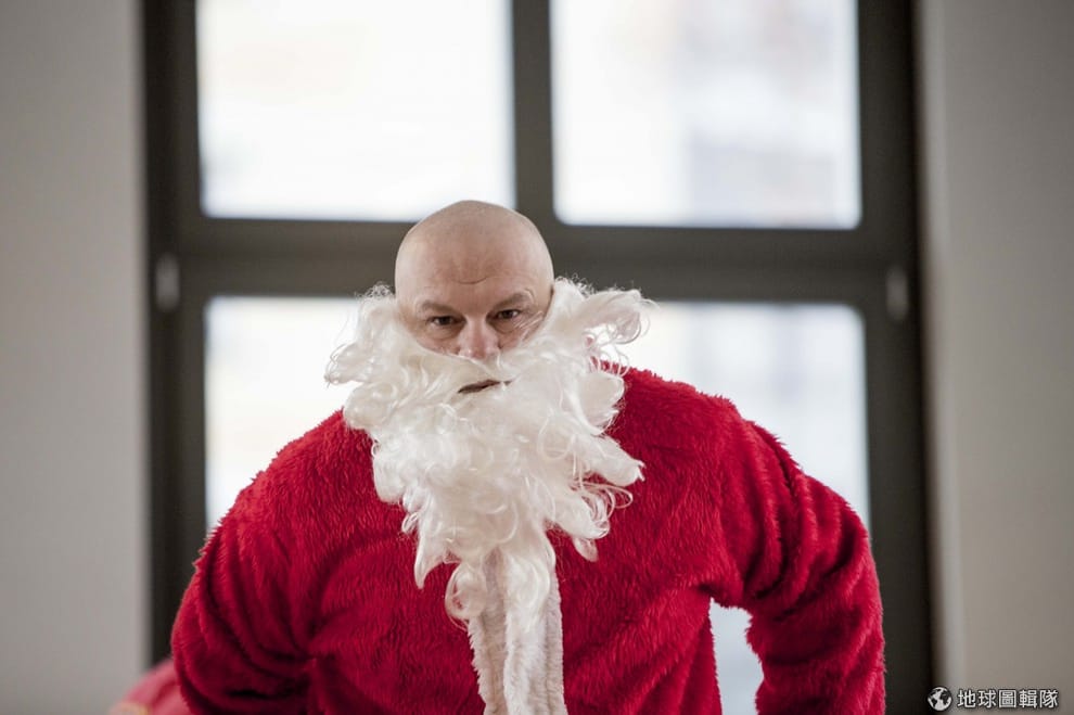 其中一位聖誕義工,他的眼神跟我們想像的慈祥聖誕老公公差好多啊!圖片來源:Carsten Koall/Getty Images