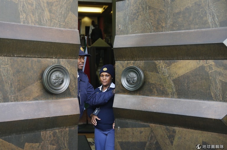 照片中的警察正要把國會大門關上,21號這天,當地的「經濟自由戰士」(Economic Freedom Fighters)黨拒絕離開國會大樓,他們喊著「還錢來」表達對現任總統祖瑪(Zuma)把2300萬英鎊花在自家上的不滿。