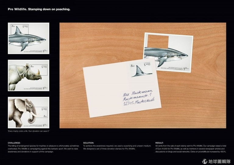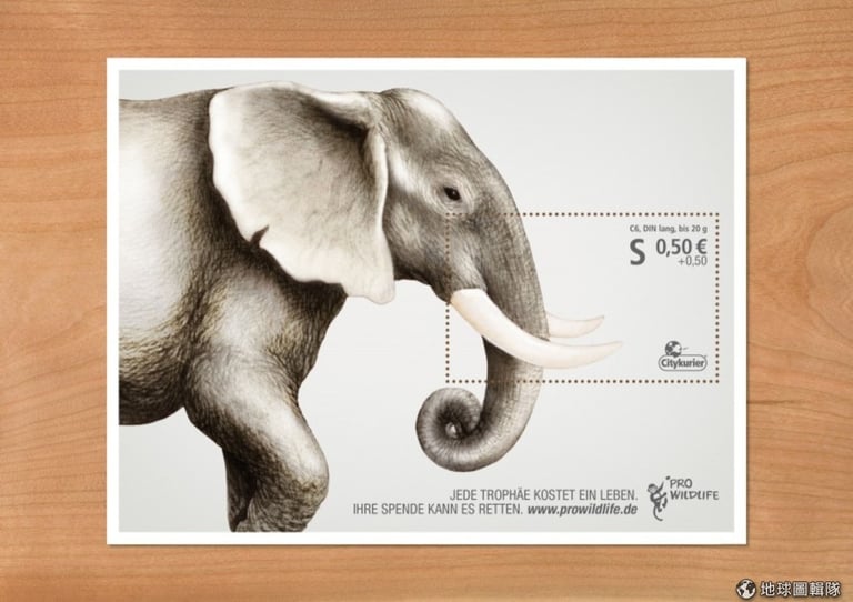 為了提高大眾對盜獵動物的意識,德國工作室Guertlerbachmann最近使用了令人驚訝與暗藏玄機的手法,為野生動物專業組織(Pro Wildlife)設計了一系列的動物郵票,所得將會由組織做為野生動物救援之用。