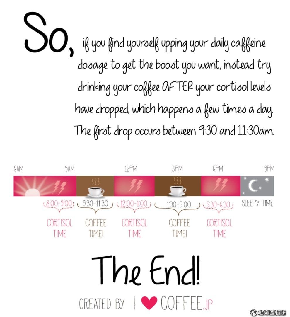 另外,皮質醇也會在中午左右再度升高,所以建議中餐後又想來杯咖啡的人,可以選擇下午1點半左右來用咖啡因醒神。