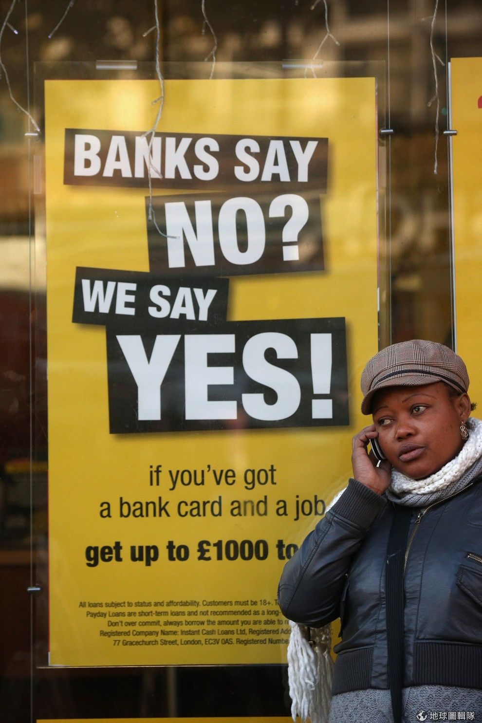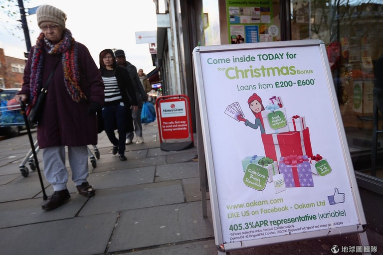 路旁的招牌寫著「趁聖誕節來,還有紅利!借款金額可達200-600英鎊」。圖片來源:Oli Scarff/Getty Images