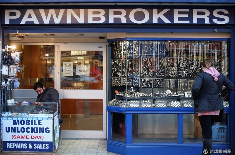 路易森街上的當鋪,有民眾正在觀察櫥窗中的首飾典當物,左邊是一個專賣手機和維修的小攤。圖片來源:Oli Scarff/Getty Images