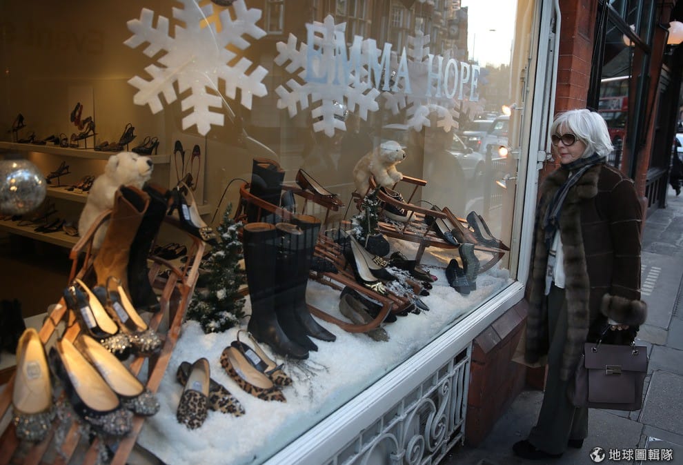 身穿皮草大衣,正在看著櫥窗內名牌鞋款的貴婦。圖片來源:Oli Scarff/Getty Images
