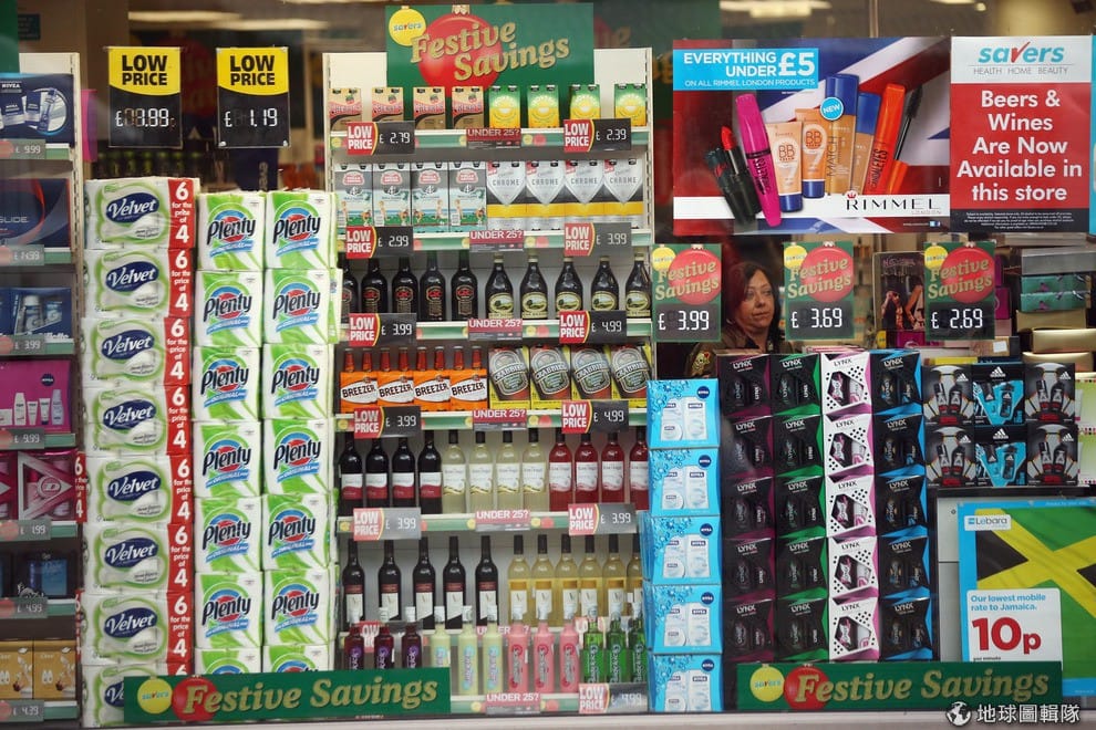 在「路易森商業街」( Lewisham high street)上的雜貨鋪,琳瑯滿目的折扣商品陳列在架上。圖片來源:Oli Scarff/Getty Images