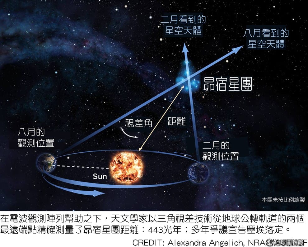 有了設備,還必須有實驗的方法。在天文學上,最可靠的距離測量法,莫過於「三角視差」。人眼可以分辨物體的遠近,是相同的道理,左眼和右眼,看到的物體相對背景之間會有位置的偏差,距離近偏差大,距離遠偏差小,人眼就有遠近的感覺,可以分辨距離。利用三角視差法,天文學家就可以精確測量昴宿星團的距離。