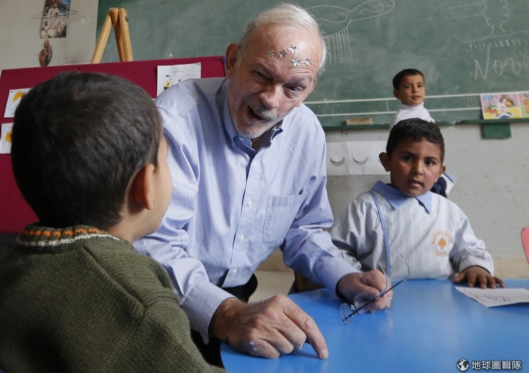 照片中UNICEF的執行主任安東尼.雷克正對敘利亞難民營裡的兒童扮鬼臉,想逗孩子笑。