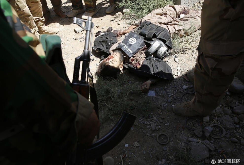 照片中是庫德族的「敢死隊」戰士們,他們一旁躺著被他們殺掉的伊斯蘭國聖戰士。