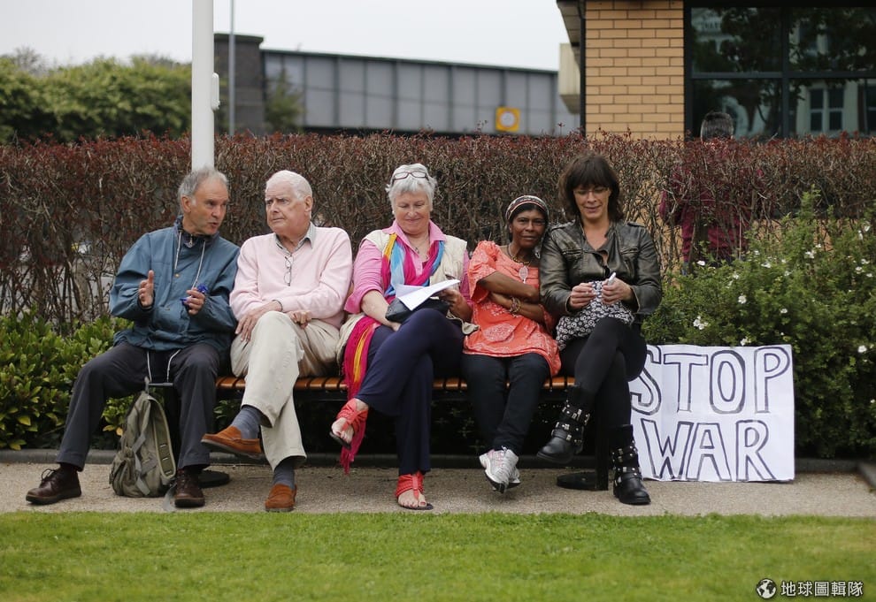 示威者趁著北約組織會議開跑,4號這天來到開會地點外進行抗議,照片中的他們正在休息中。