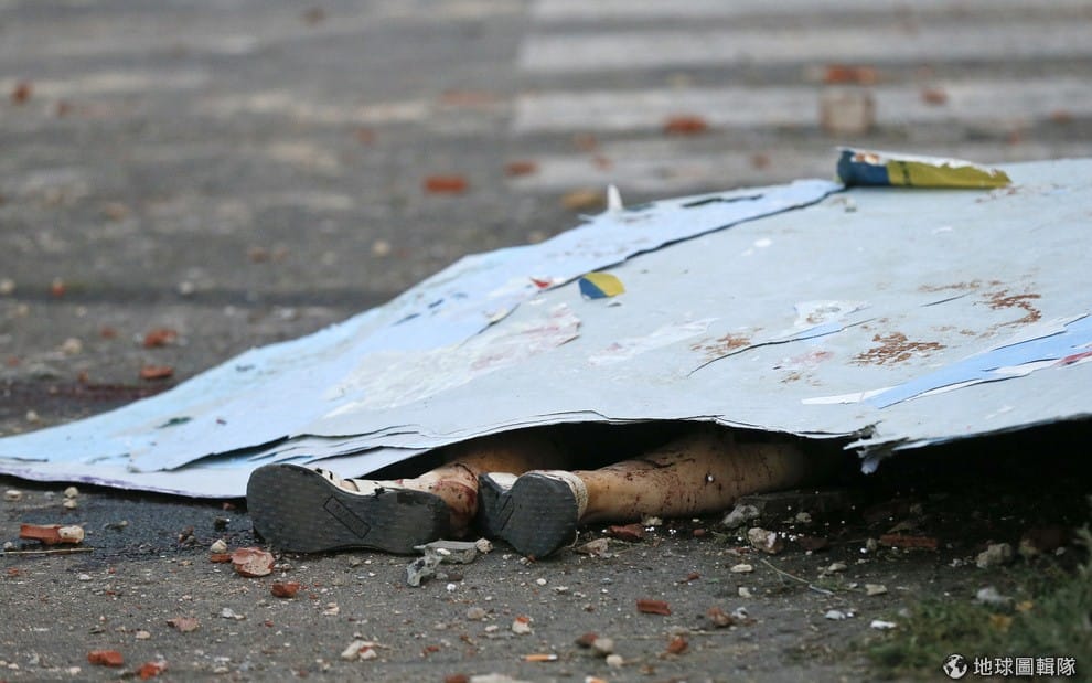 遭到烏克蘭政府軍襲擊身亡的民眾躺在地上。
