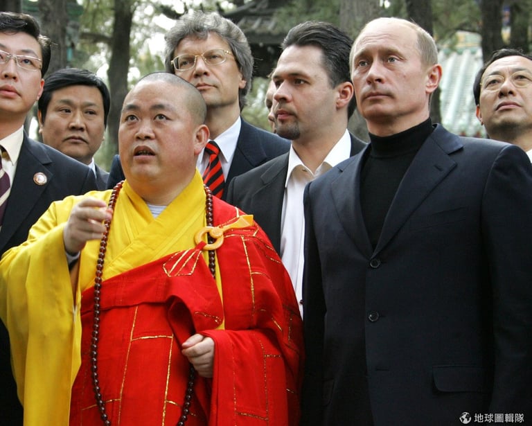 2006年時,俄國總統普亭曾到少林寺參訪,一旁的僧侶就是釋永信董事長