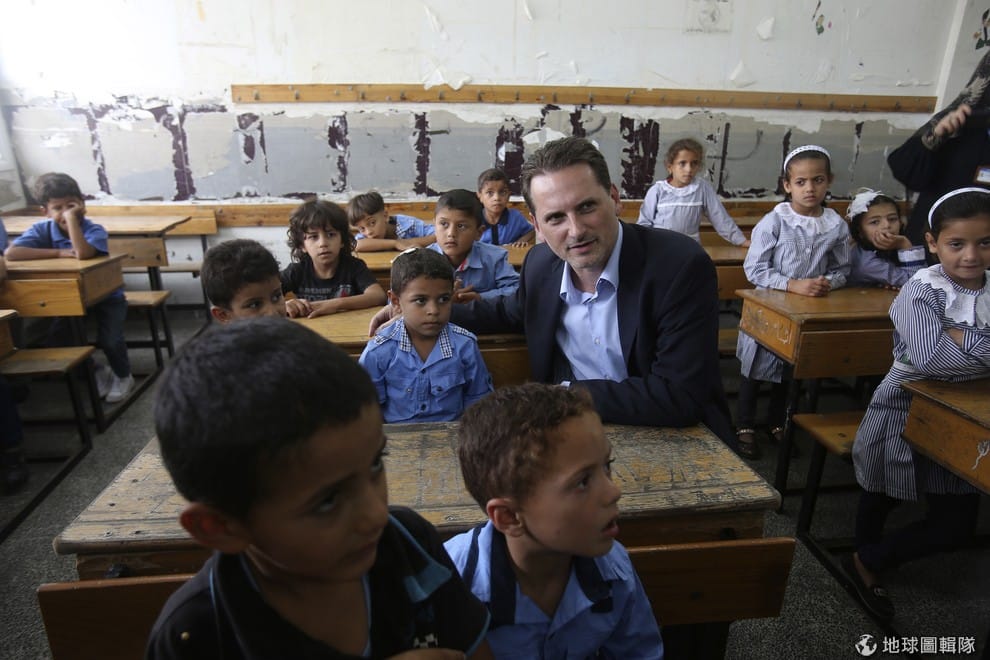 聯合國難民救助工程局(UNRWA)的負責人皮耶爾(Pierre Krähenbühl)在開學日這天來訪視加薩走廊的孩子們。