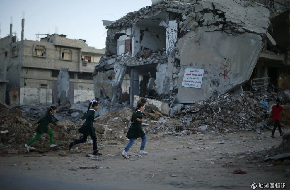 路透社加薩走廊許多學校在戰火中被摧毀,照片中的學生在一片泥沙的街道中奔跑