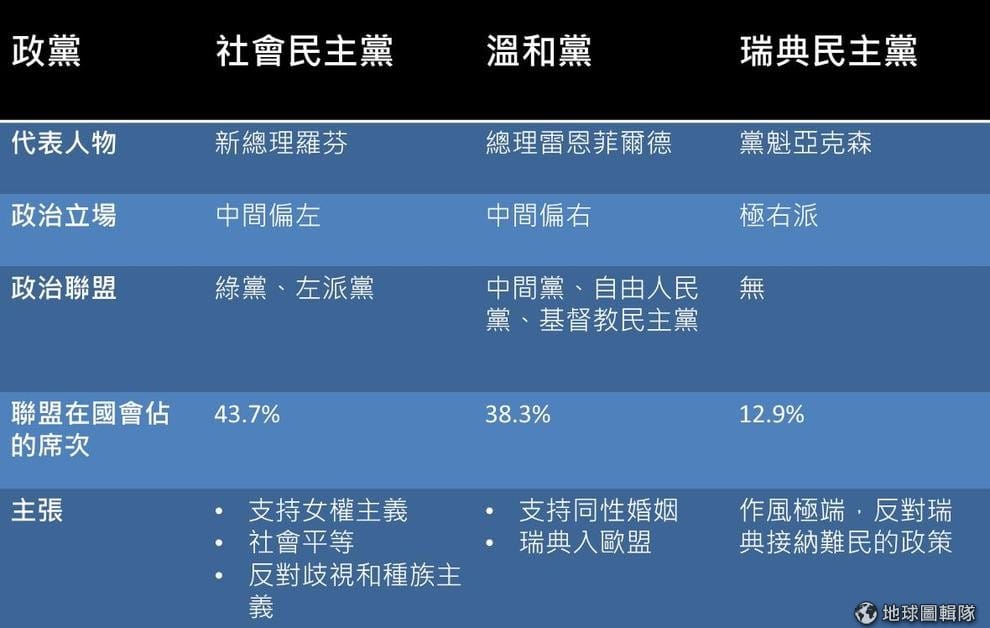 瑞典3大政黨──社會民主黨、溫和黨、瑞典民主黨資訊整理。數據來源:半島電台