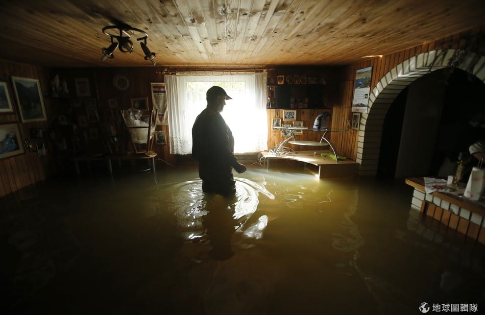 民眾看著自己被大水淹沒的家,克羅埃西亞中部的萊托維尼克(Letovanic)一帶傳出大水災情,照片中的民眾只能走在淹水的大街上。目前已知當地的中部21個縣市中,有2/3的市鎮受到大水侵襲,幸無傳出人員傷亡的消息。