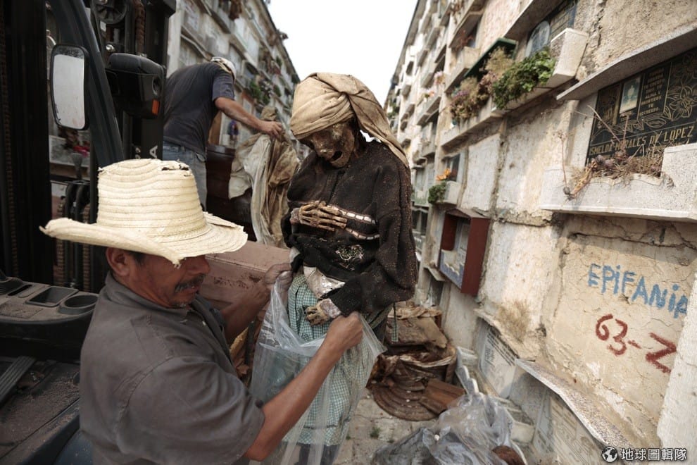 工人們忙著把已經木乃伊化的遺體抬出,這張照片攝於2013年4月17日,瓜地馬拉當地會針對牌照過期的墓穴進行清理行動,如果墳墓的執照過期,也沒有付錢,那麼清除工人就會進入地穴,把原本埋葬的遺體挖出移走,如果沒有家屬認領,那無名遺體就會被打上標籤並下葬到公墓區。通常,葬在墓園上半區的遺體,因為接觸到乾燥的空氣和陽光,往往會呈現木乃伊化的狀態。