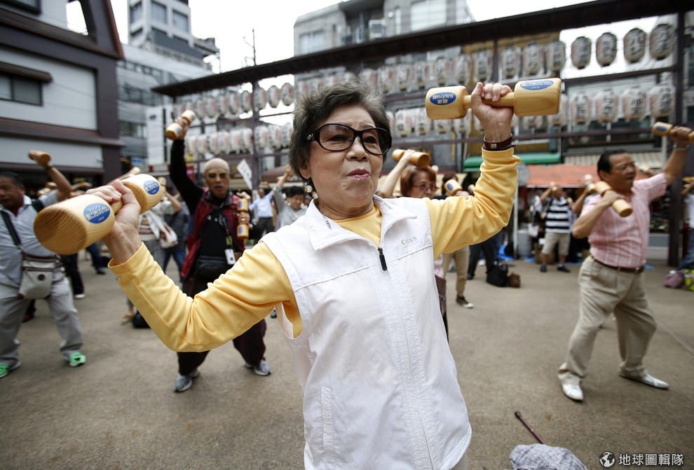 15號這天是日本的「敬老節」,東京巢鴨區可以見到熟齡族手拿木製啞鈴做運動。日本65歲以上的高齡約有3300萬人,這已經是日本史上最高紀錄,也顯示出每4人中就有1人是熟年人口。