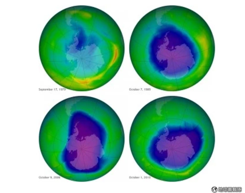 這張由 NASA 提供的圖顯示多年來臭氧層破洞的變化,四張圖記錄的時間點分別是,左上方 1979 年九月,右上方 1989 年十月,左下方 2006 年十月,右下方 2010 年十月。顯示臭氧層的破洞終於開始出現復原跡象。
