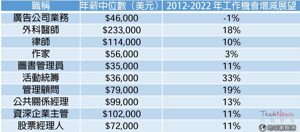在十大「金玉其外」工作的名單中,廣告公司主管與外科醫生都在榜內,因其工作環境屬高壓力,津貼及工作前景也不如外界想像中好(如上圖)。
