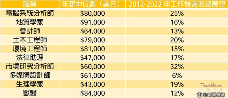 其他爽缺包括年薪中位數為 6.4 萬美元的會計師、7.9 萬美元的土木工程師、8.1 萬美元的環境工程師、4.7 萬美元的法律助理、6 萬美元的市場研究分析師、6.1 萬美元的多媒體設計師、4.3 萬美元的生理學家、8.4 萬美元的獸醫。