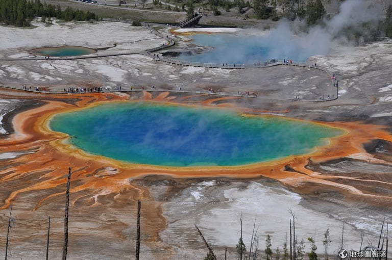 喜歡趴趴走的旅人,對這個地方可能很熟悉,這是美國知名的大稜鏡溫泉((Grand Prismatic Spring),又稱虹彩溫泉),它就在許多觀光客都會到訪的黃石公園中,大稜鏡溫泉是黃石公園裡最有名的間歇泉之一。