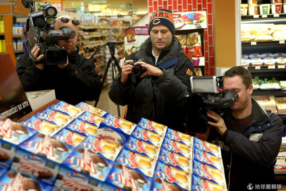 2萬盒的商品被鋪貨在芝加哥當地的商店中,媒體都來爭拍這最後的滋味。圖片來源:Scott Olson/Getty Images