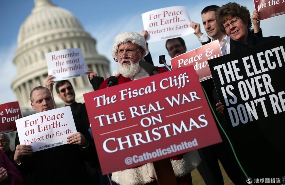 美國民眾打扮成聖誕老公公,特地跑到國會山莊前面,表達對政府經濟措施的焦慮!因為再過18天,沒有想出替代法規的話,美國的財政會出現大危機!連動全球經濟都會受創!快點通過吧!圖片來源:Win McNamee/Getty Images