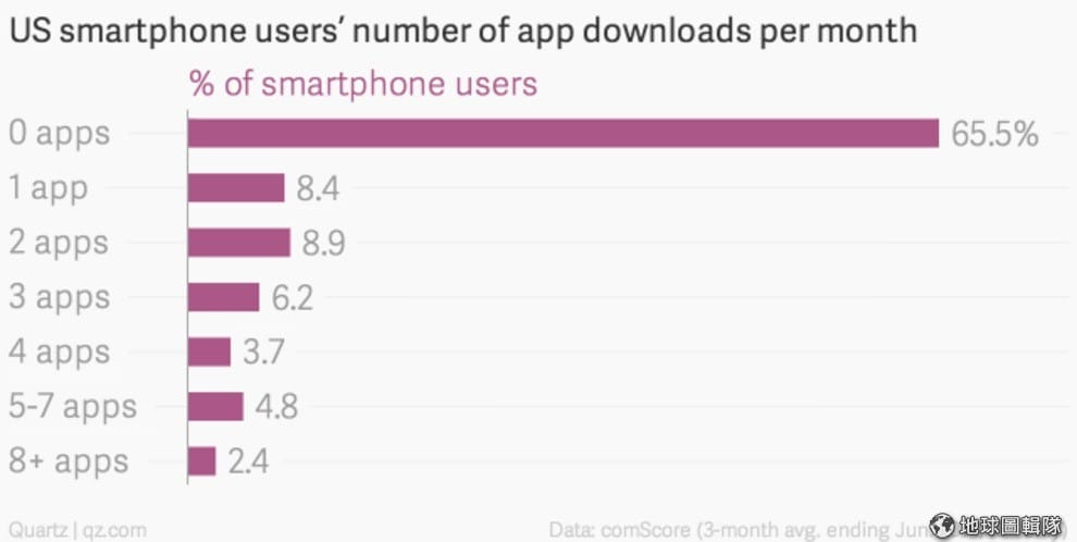 而著名網路分析公司 Comscore 做出的報告更是嚇人,在美國居然有 65.5 % 的用戶每個月都已經不再下載新的應用程式,但美國的智慧型手機用戶有超過 50% 每天都會使用不同的應用程式,根據 Quartz 分析認為,這可能代表人們已經不再需要這麼多的 App,他們常用的 Apps 已經足以應付他們的日常生活。