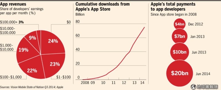 2008 年到現在,蘋果稱他們已經向應用程式的開發者支付了超過 200 億美元,而 Google 委託的調查則預測到 2025 年,為智慧型手機開發應用程式的收入將超過 510 億美元。