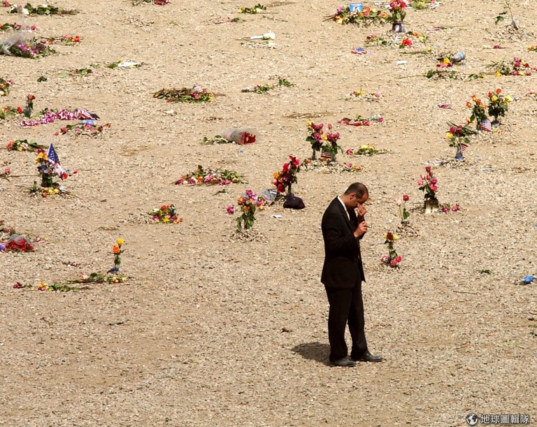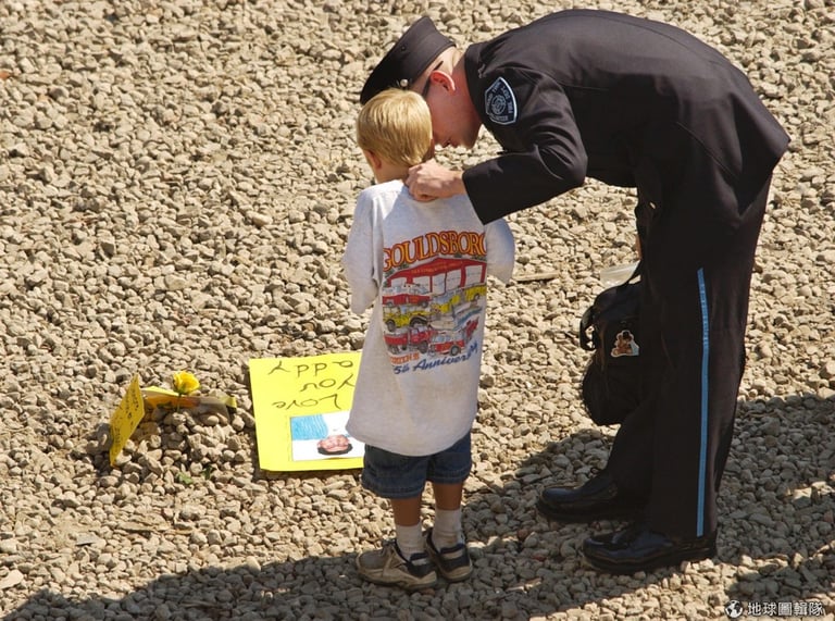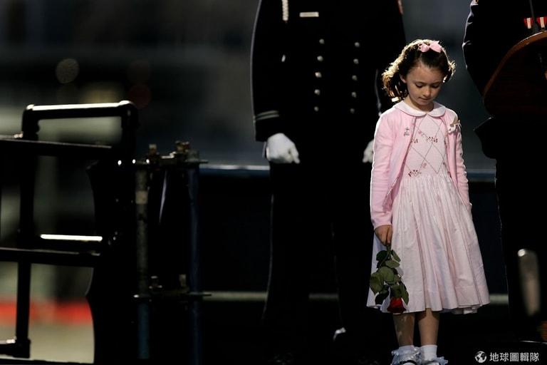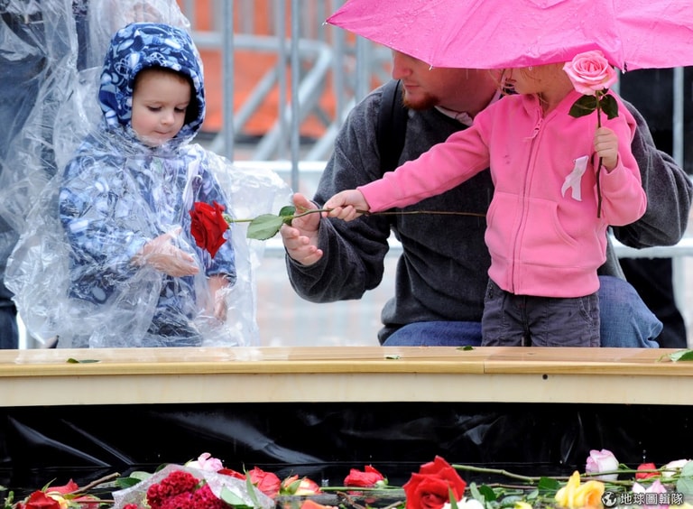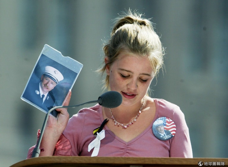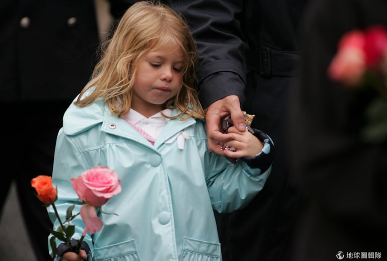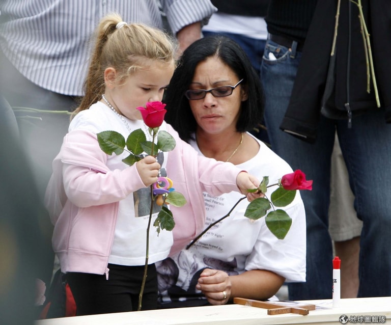 卡珊卓(Cazzandra Peterson)與她的媽媽正在獻花給她再也沒有機會見到面的爸爸,因為她的爸爸已經在911事件中喪生。