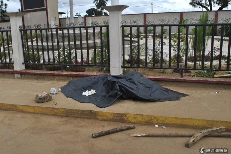 賴比瑞亞當地街頭上,一具蓋上防水布的屍體正等待人員檢查是否有染上伊波拉病毒,當地官員表示,這是現在賴比瑞亞境內的標準程序。