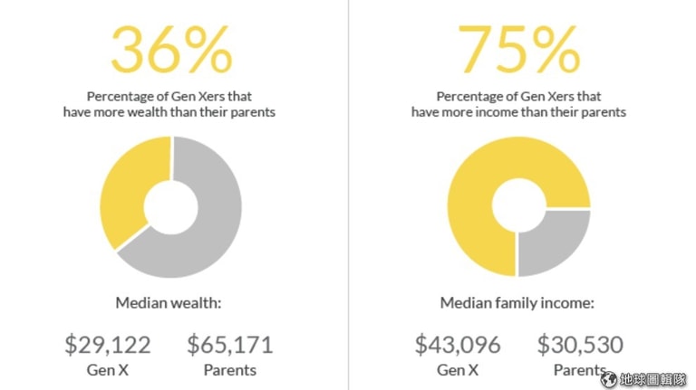 調查結果顯示,75% 的 X 世代比他們的父母輩賺得還要多,多出 13,000 美元,相當於 40 萬台幣;但只有 36% 的 X 世代累積的財富多於父母輩在同一年齡所累積的,多數 X 世代累積的財富遠比父母輩少了約 35,000 美元,相當於 100 萬台幣。